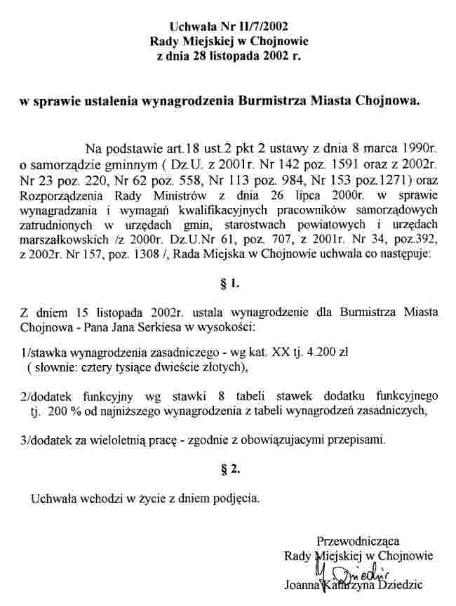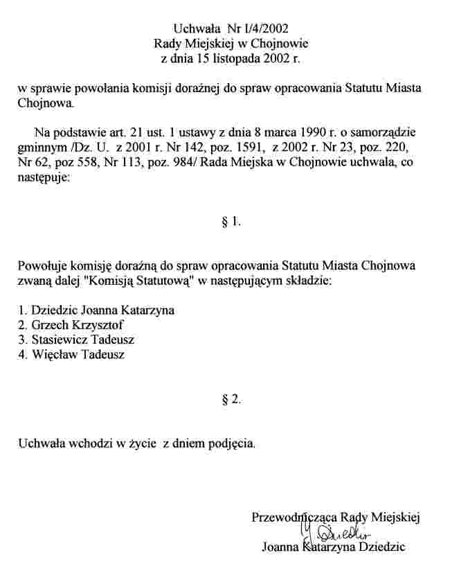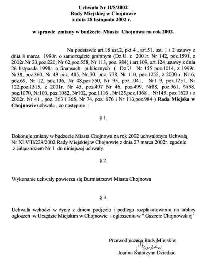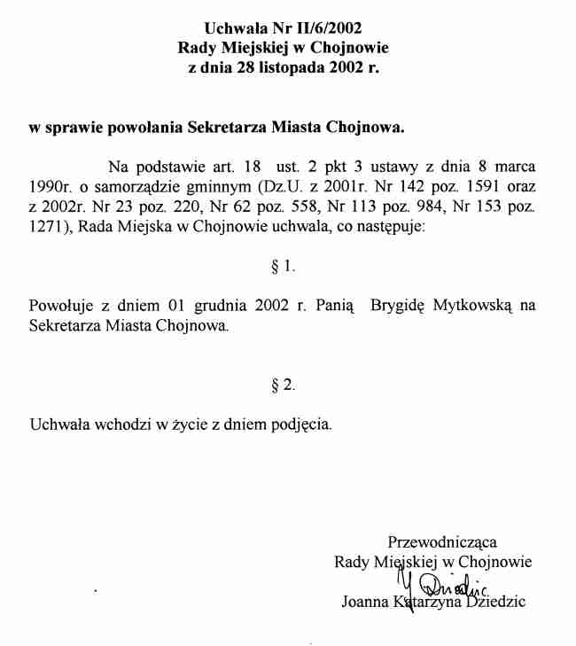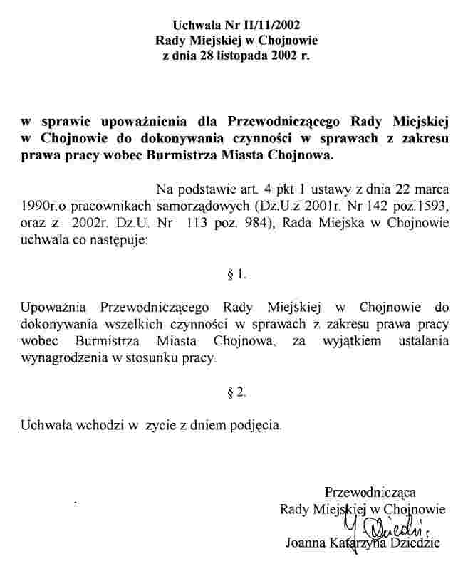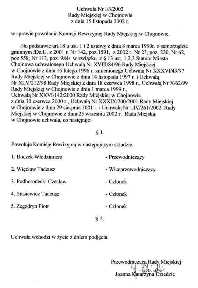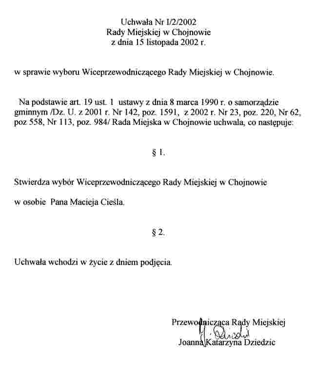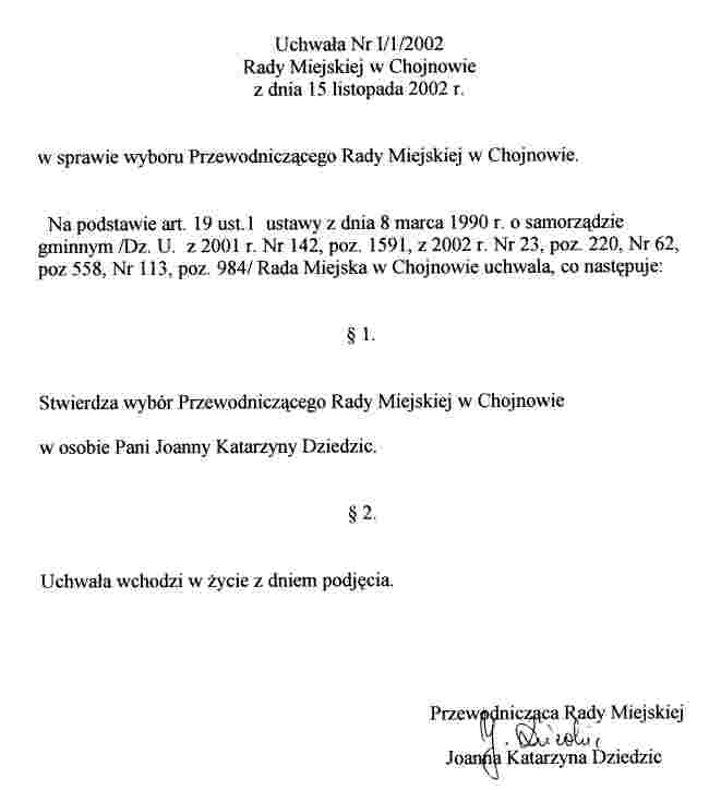 | Osoba, która wytworzyła informację: | Przewodniczący Rady Miejskiej Chojnowa |